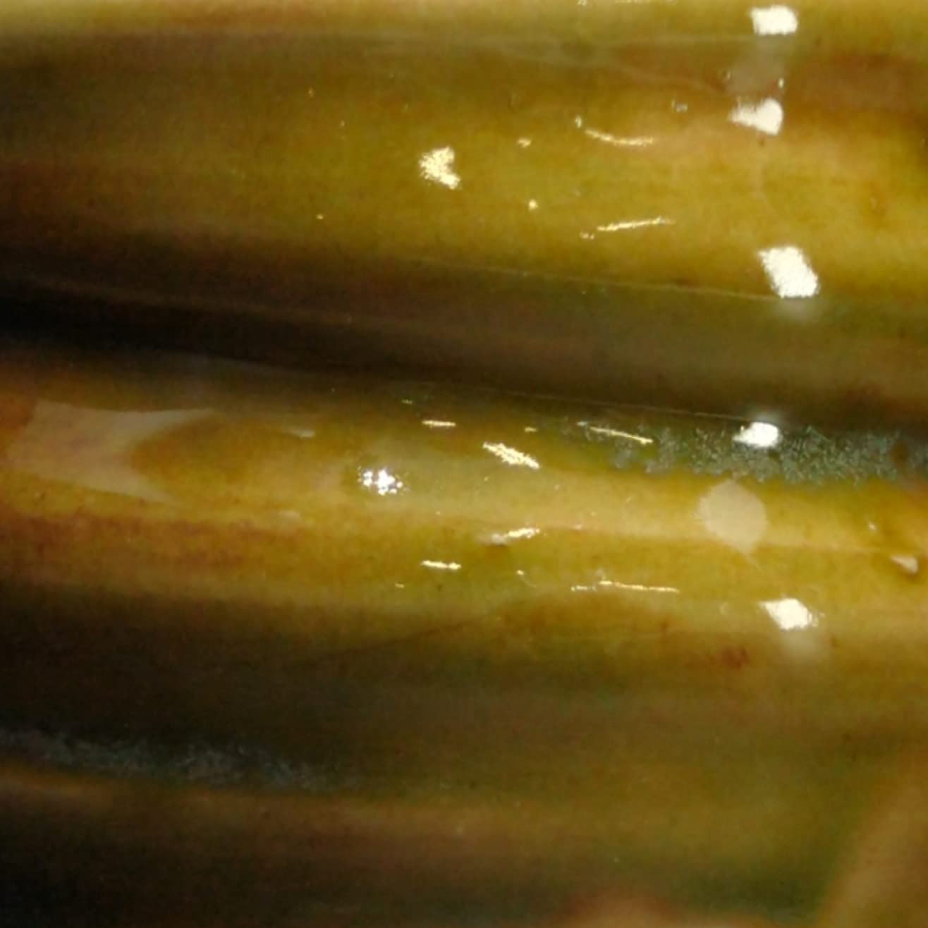 - [COLOR PROFILE] - Arugula Gloss features a rich olive-green glaze with golden-brown undertones and a high-gloss finish. The surface shows subtle shifts in hue, with hints of amber and darker green pooling in recessed areas. Light reflections enhance the glaze’s depth and smooth texture.