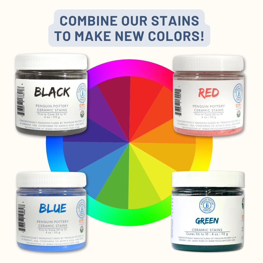 Penguin Pottery - Variety Set of 4 Ceramic Stains - 6 oz Black, 4 oz Each of Red, Blue and Green - Colorants for Clay, glazes, Clay Slip Pottery Glaze, Ceramic Glaze